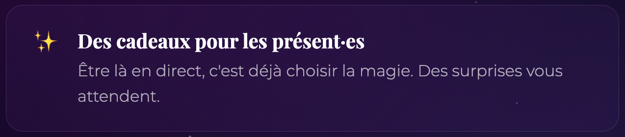 Des cadeaux pour celles et ceux qui sont présents en direct. ✦